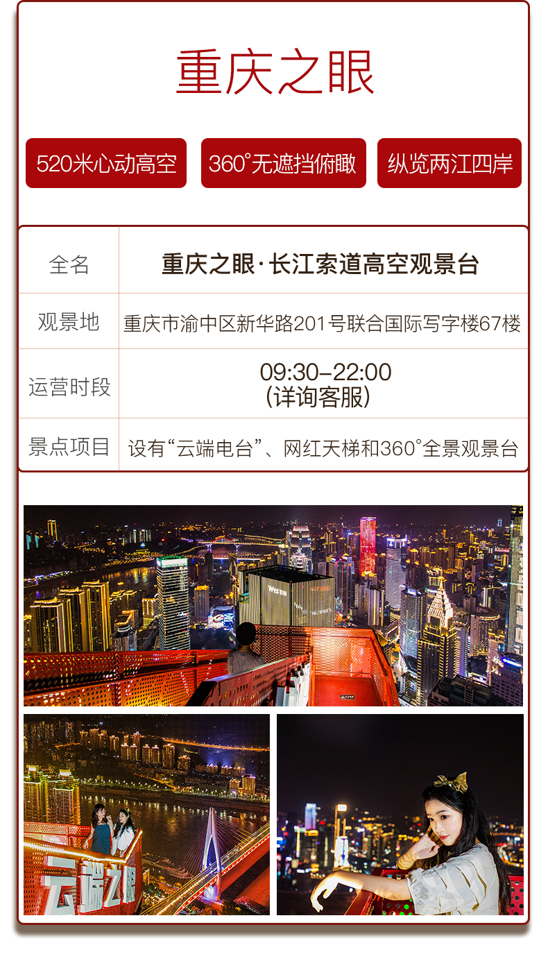 重庆海峡国际旅行社 > 线路 > 重庆线路 > 长江索道线路 > 【单门票】重庆之眼高空观景台门票/长江索道/洪崖洞重逢1980/巴渝十二景 当地游 编号:A2893 【单门票】重庆之眼高空观景台门票/长江索道/洪崖洞重逢1980/巴渝十二景 推荐理由:360度观赏重庆美景,悬空楼梯拍摄大片 ¥ 26 起 起价说明 线路特色: 联系客服: 唐琼 唐琼 电话:13608325500 座机:63718080 QQ:2850360365 王鸿 王鸿 电话:13608360055 座机:63709966 QQ:3004334179 线路简介: 微信扫码预定 套餐选择: 出发时间: 暂无报价 出游人数: 成人: - + 儿童: - + 立即预定 *日历上显示的价格为当日最低成人优惠价,请以客服与您最终确认的为准。 重庆之眼 重庆之眼+长江索道往返 重庆之眼+洪崖洞重逢1980 洪崖洞重逢1980+巴渝十二景 洪崖洞重逢1980 游客点评 购买咨询 相关线路 立即预定 重庆之眼 重庆之眼+长江索道往返 重庆之眼+洪崖洞重逢1980 洪崖洞重逢1980+巴渝十二景 洪崖洞重逢1980 游客点评 满意度 100% 来自0名游客的点评 导游服务 5.0/5.0 往返交通 5.0/5.0 线路游玩 5.0/5.0 餐饮住宿 5.0/5.0 出游归来发点评送积分 可换购超值实物商品 发表点评 购买咨询 问题详细描述 会员登录后咨询 昵称: 验证码: 相关线路 更多 >>