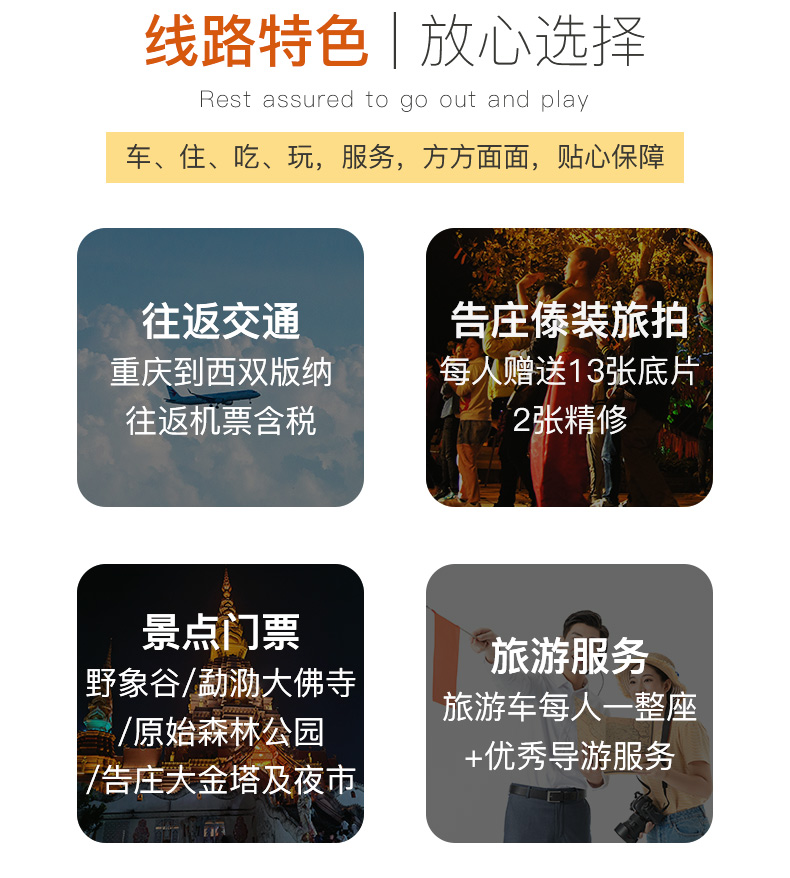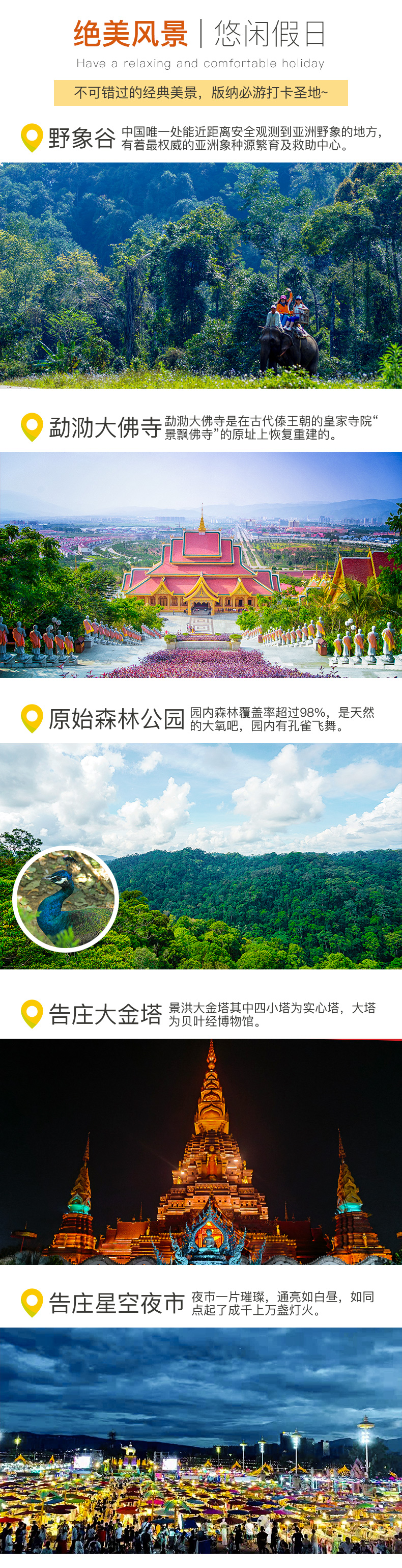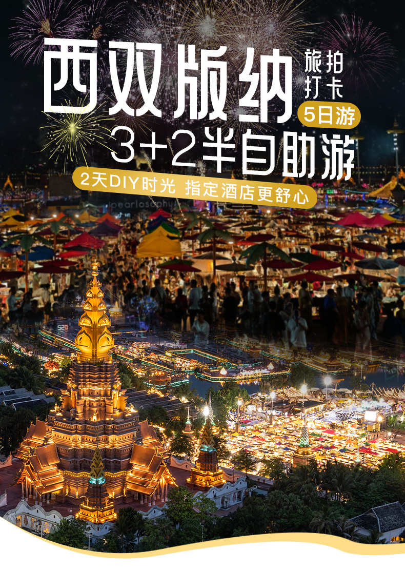 之后前往【告庄西双景傣装旅拍】(每个人赠送13张底片,2张精修)赠送版纳最美网红旅拍,感受民族特色美,做一回唯美傣家人,留下版纳最美的印记。可自行前往参观【告庄大金塔】、【告庄星空夜市】,湄公河•星光夜市一片璀璨,通亮如白昼,如同点起了成千上万盏灯火,更像灯火的海洋,璀璨耀眼,如天边的银河,美不胜收。