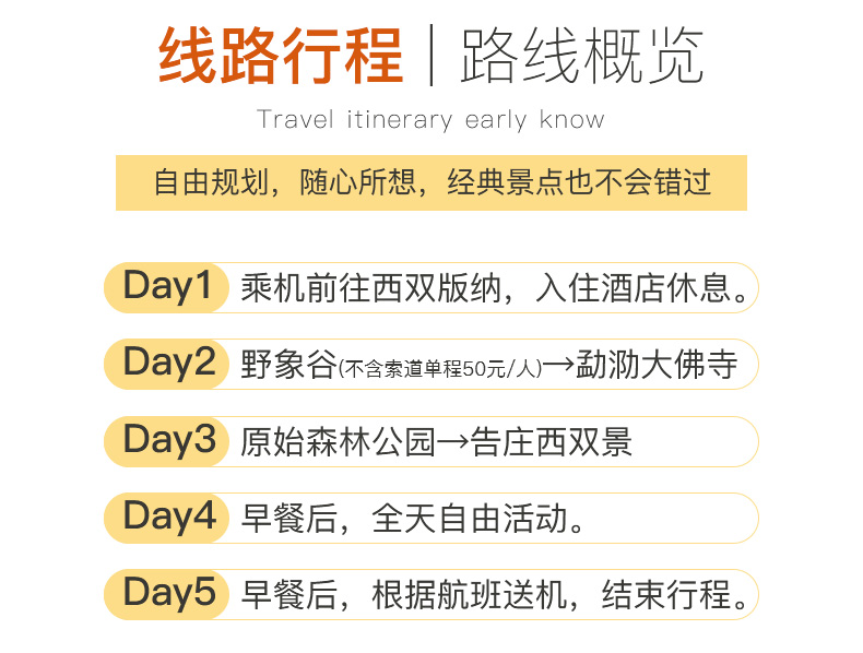 4、西双版纳为少数民族自治区,游览时请尊重傣族和其他少数民族的生活习惯;不要随意进入傣族的卧室,及随意触摸小和尚的头部。