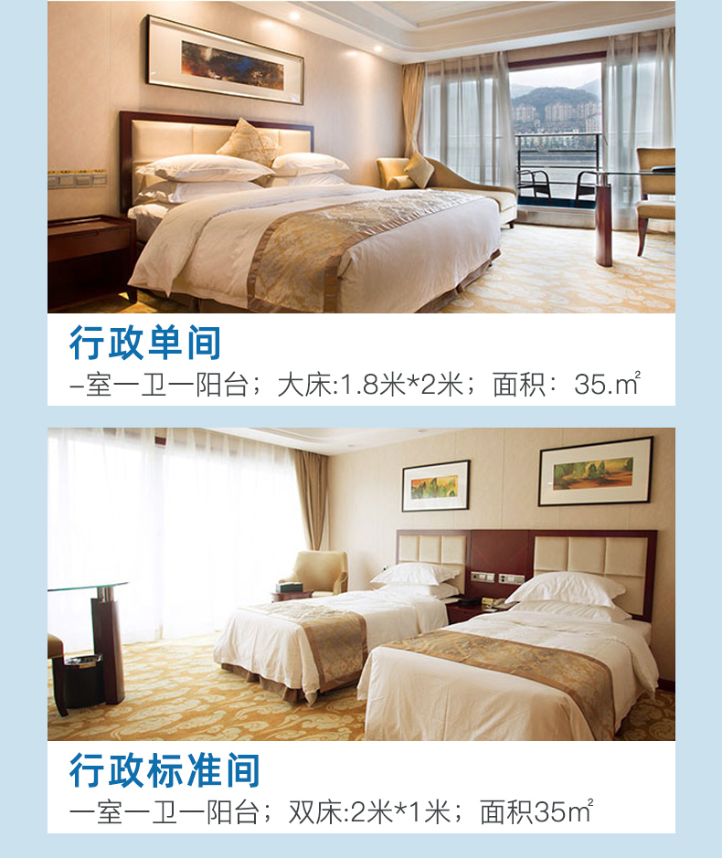 2、住宿:所预定游船标间,1个人用1个床位(平铺、空调、彩电、独立卫生间)。