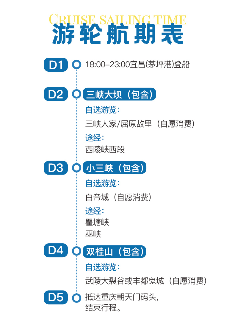 18:00-20:30 宜昌茅坪码头登船,可在宜昌市区乘坐“豪华游轮专用巴士”前往或自行前往码头登船。