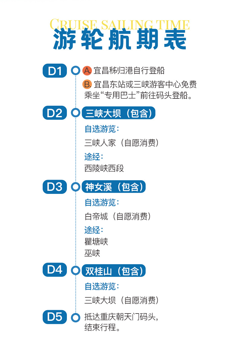 17:30-20:00 B. 宜昌东站或三峡游客中心免费乘坐“豪华游轮专用巴士”前往码头登船。