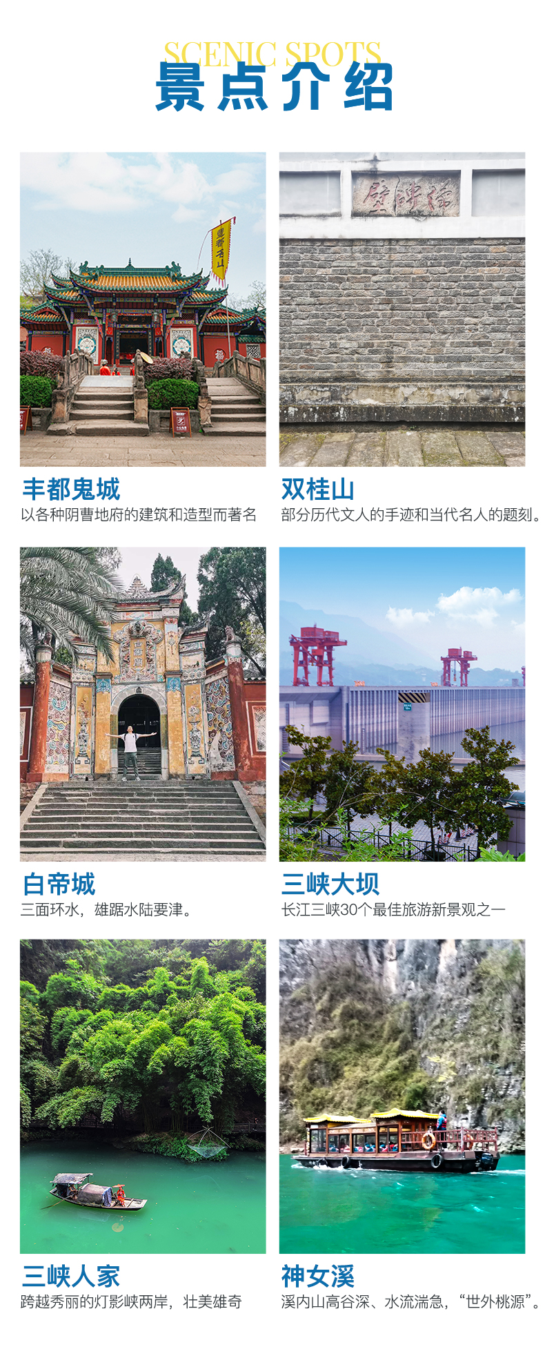 B、双桂山、神农溪、三峡大坝景点首道门票(包含景点为赠送,放弃游览及门票优惠均不退费用)。