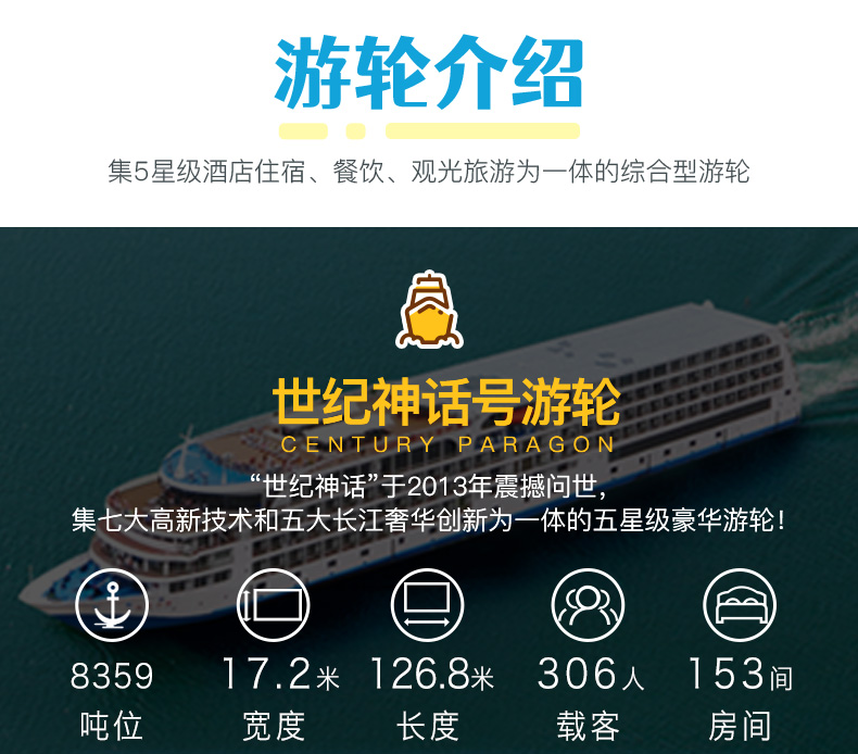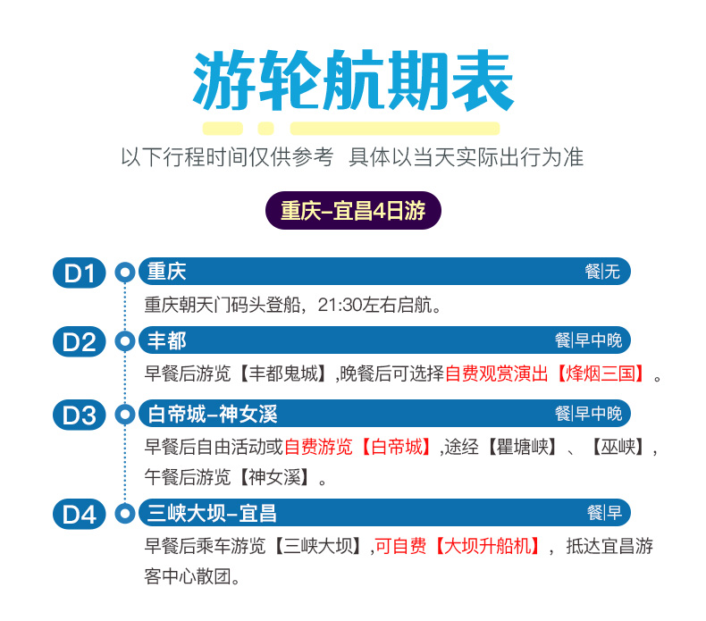 4、自费景点:烽烟三国 290 元/人,白帝城 290 元/人,升船机 290 元/人(自费景点船方选择性停靠,不参加的客人在船上休息,不能下船)。