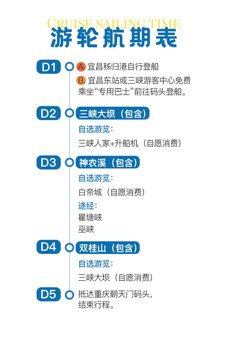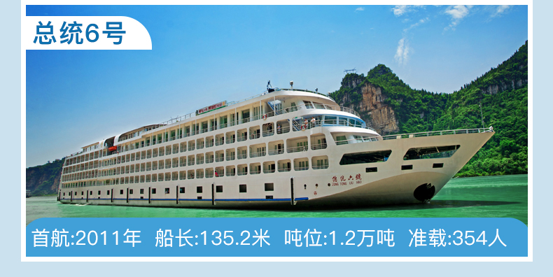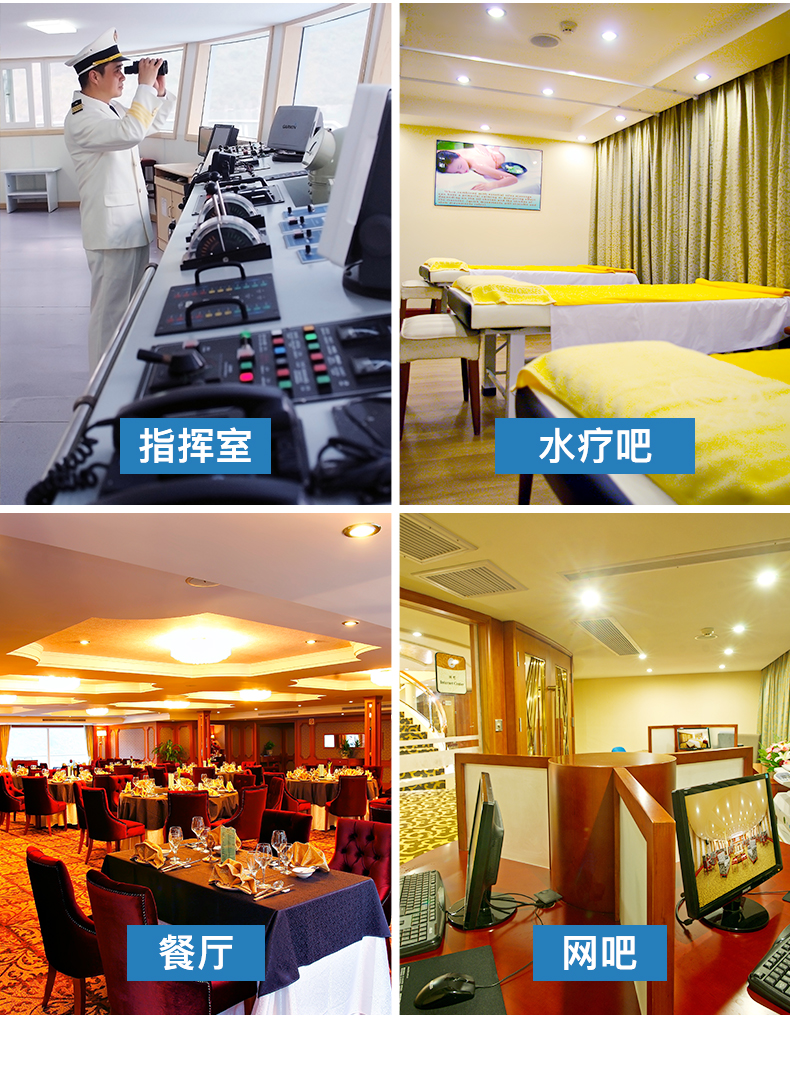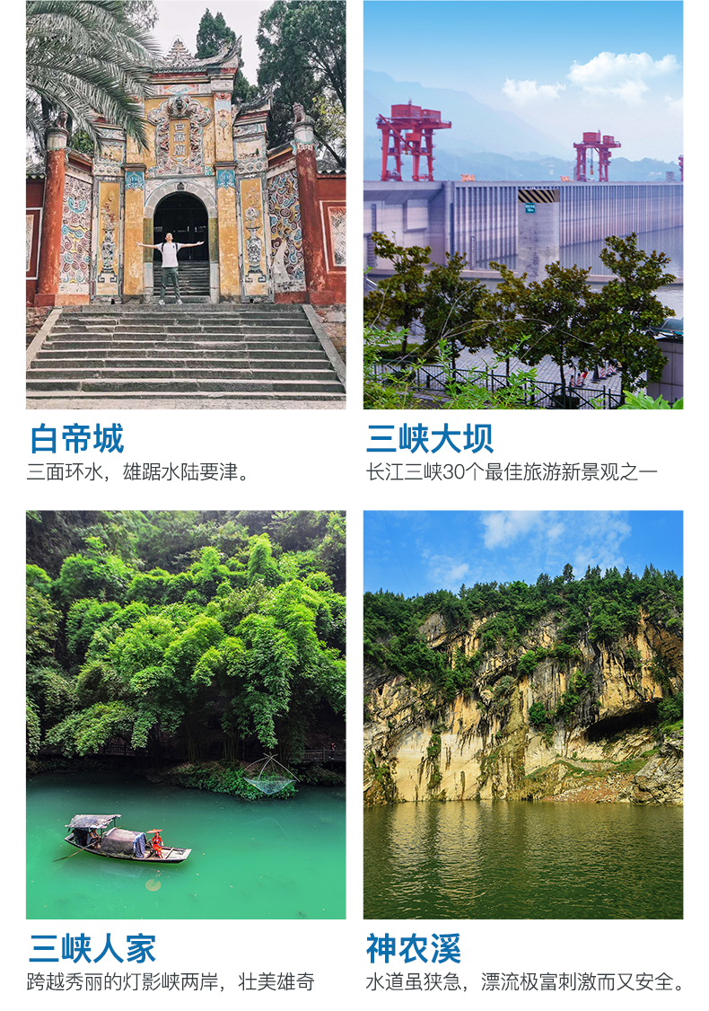 4、自费景点:三峡人家 290 元/人,升船机 290 元/人,白帝城 290 元/人,丰都鬼城290元/人(自费景点船方选择性停靠,不参加的客人在船上休息,不能下船)